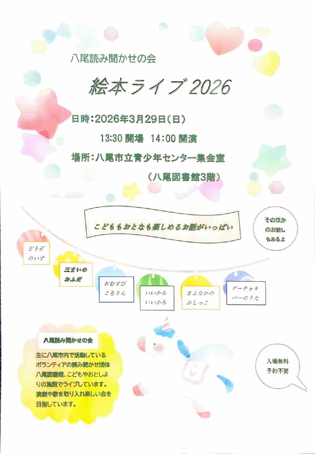 | 場所 | 八尾(やお)青少年センター(八尾(やお)図書館3階) |
