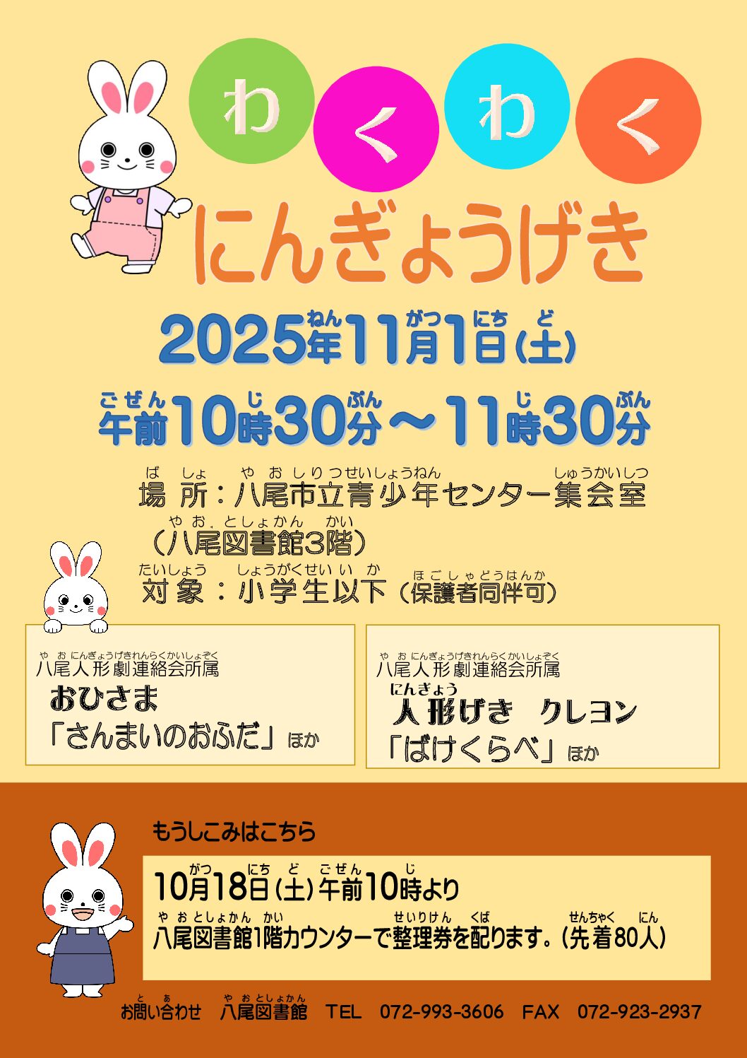今年の人形げきも、やお人形げきれんらく会しょぞくのげきだんによる、ごうか2本立て!! ・人形げき クレヨンによる「ばけくらべ」ほか ・おひさまによる「さんまいのおふだ」ほか