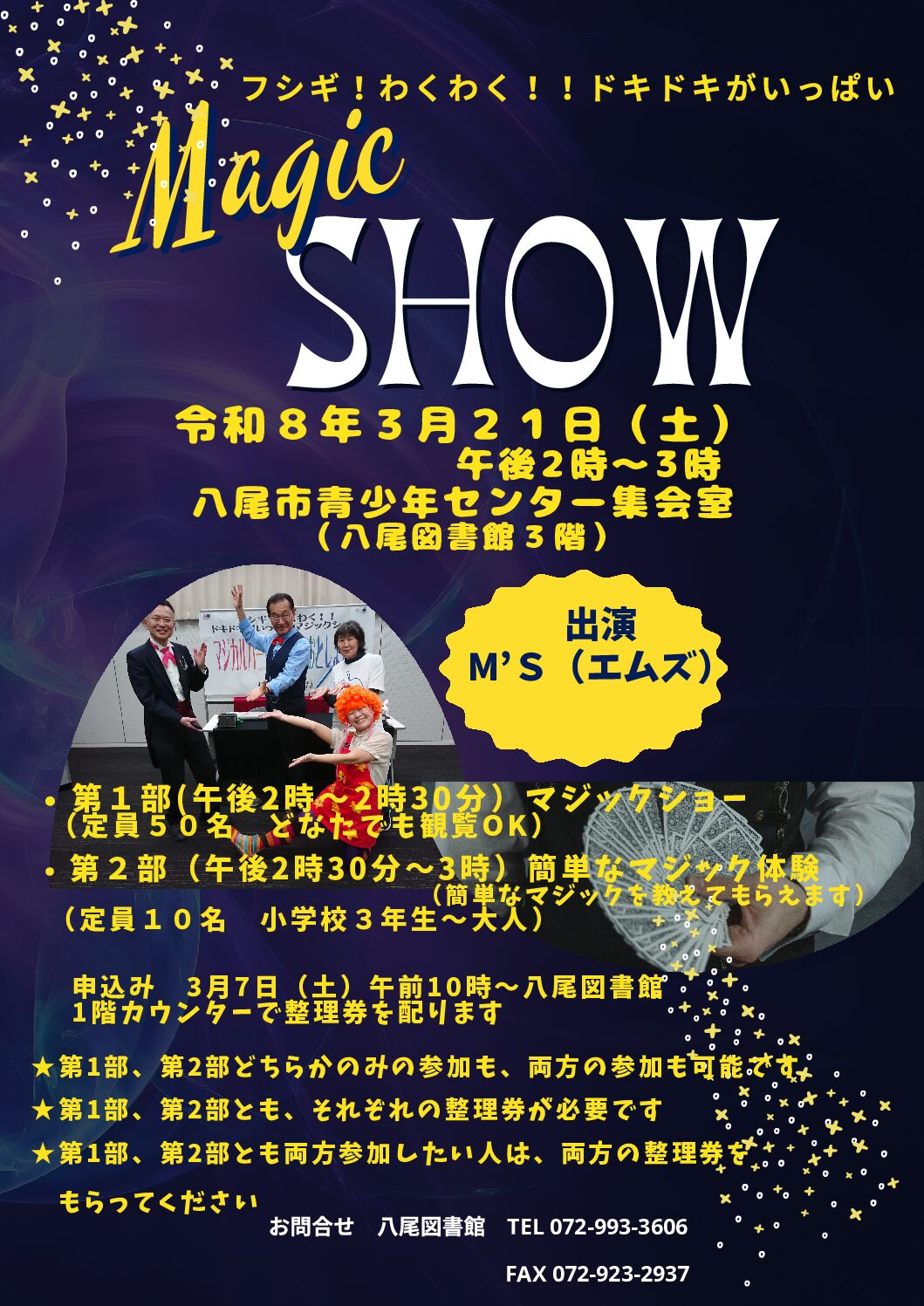 マジックパフォーマー M’sさんによる、不思議な不思議なマジックショー!! M’sさんからマジックを教えてもらえる体験の時間もあります。 イベントないよう ・第1部 … 続きを読む